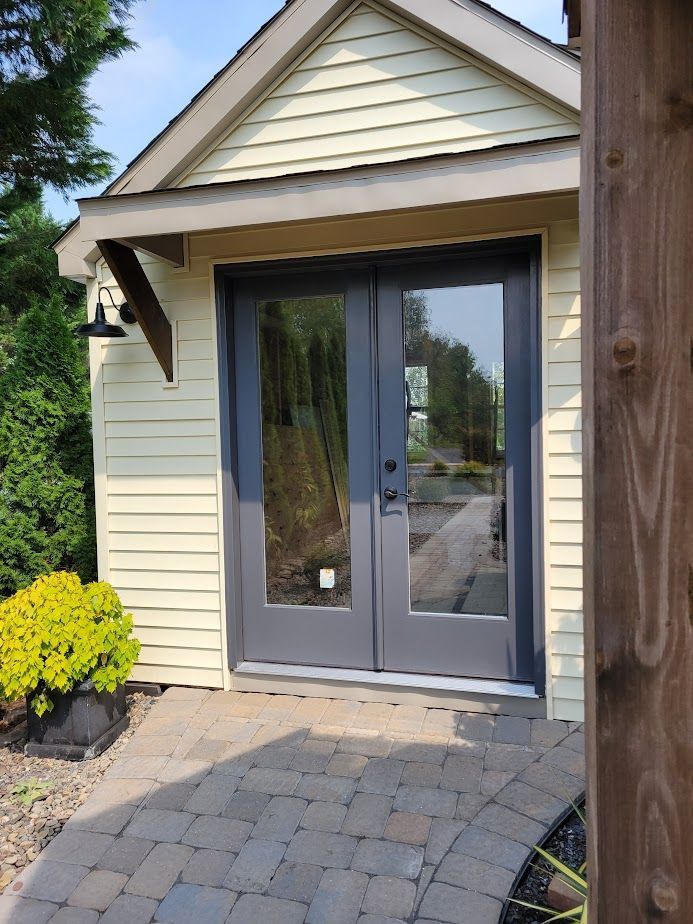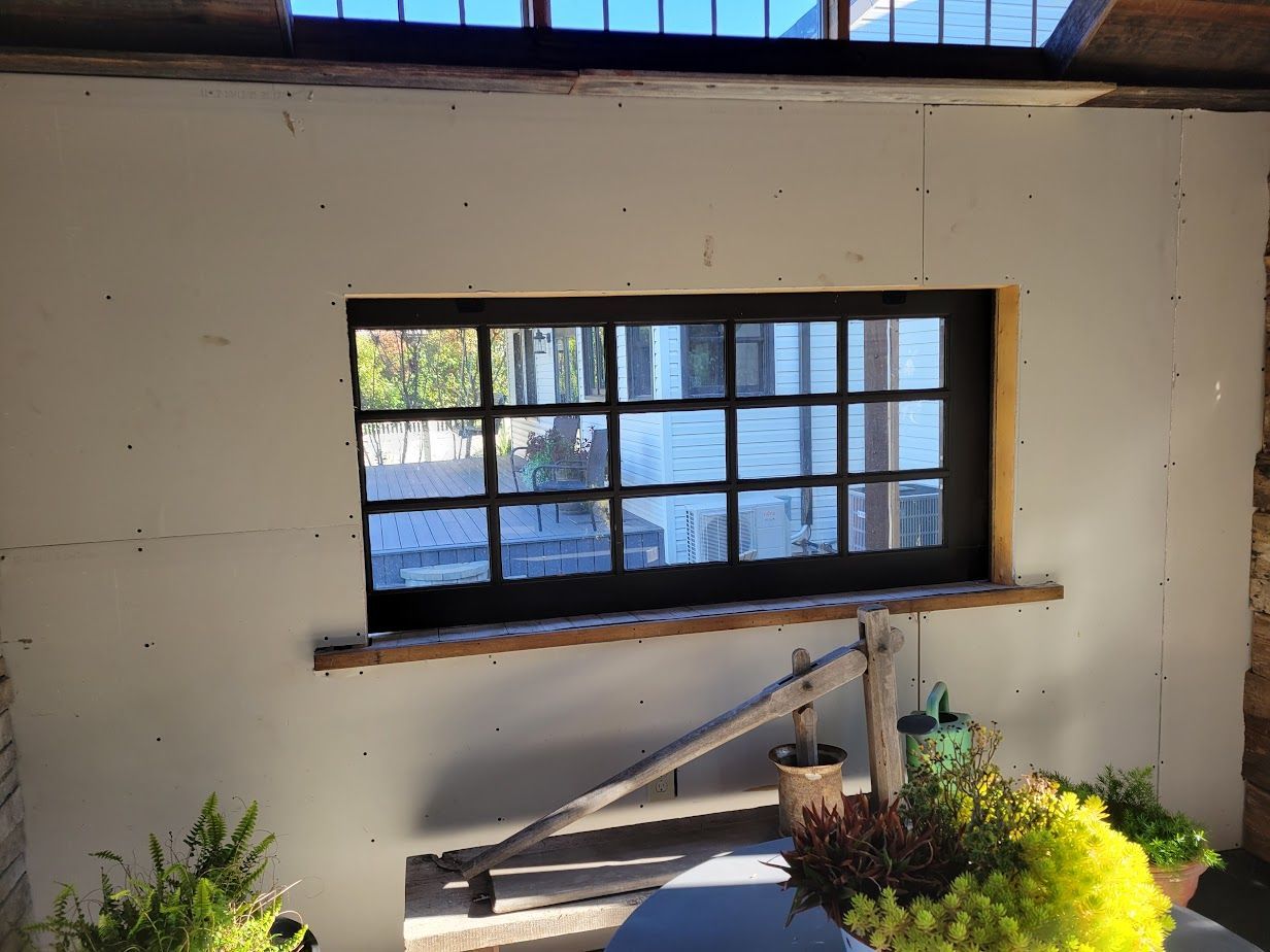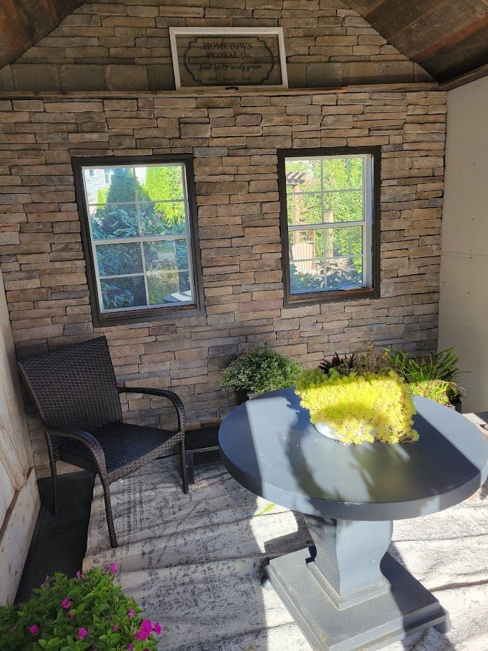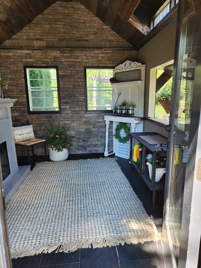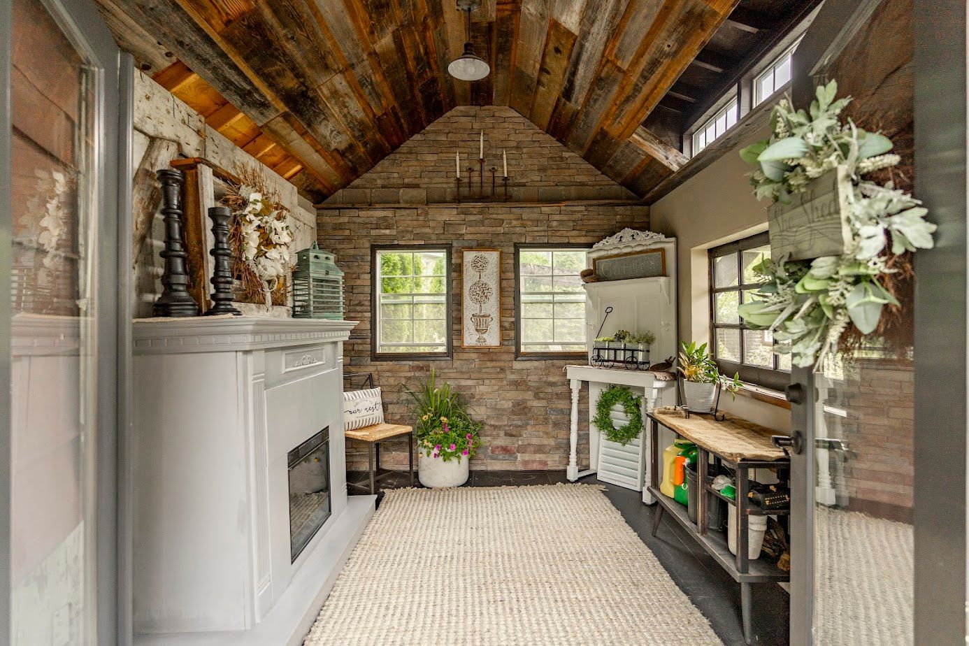 Created from a single picture in 2021, this 10 × 12 she-shed became the cozy escape every gardener dreams of. Our Amish partners erected the shell siding, roof, and sun-splashed windows. Then we layered in character: a dry-stack stone feature wall, oversized reclaimed barn doors, and a soft-gray electric fireplace for four-season comfort. Mushroom-board ceilings and barnwood shelves keep the rustic soul alive, whereas the recent addition of a mini split will allow for winterizing plants.